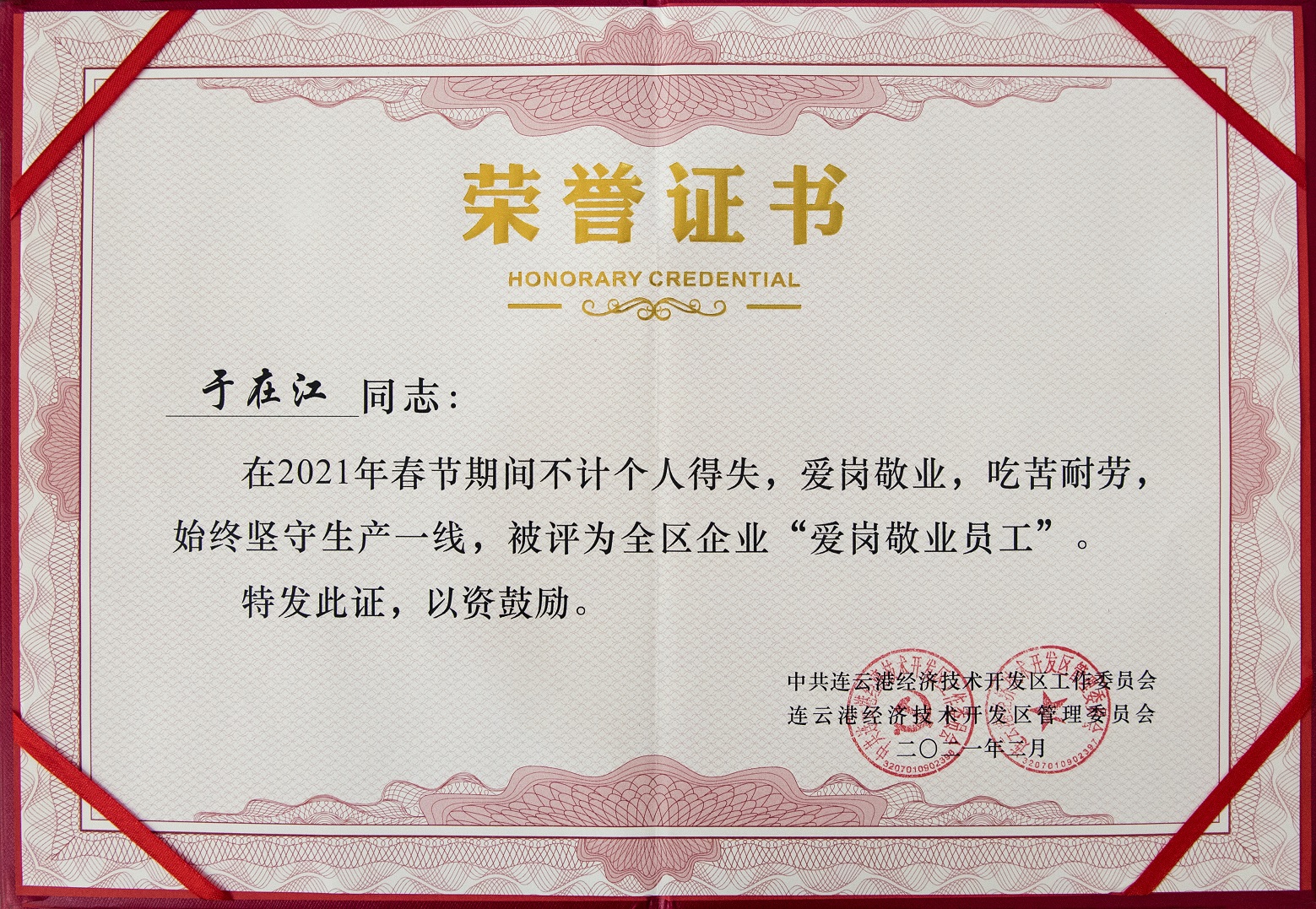 表彰會上,我公司總經理徐根華榮獲“2020年度連云港經濟技術開發區功勛企業家”榮譽稱號,“中金工匠”于在江被評為全區企業“愛崗敬業員工”榮譽稱號。